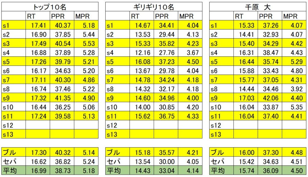 下の表は、予選通過上位10名の平均、ギリギリ予選通過10名の平均、最後に私の平均だ。だから何だと言われたら特に何もないが、個々で何かしらの指標になれば幸いだ。