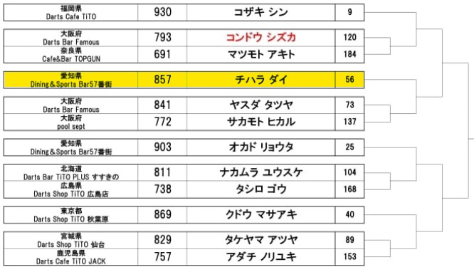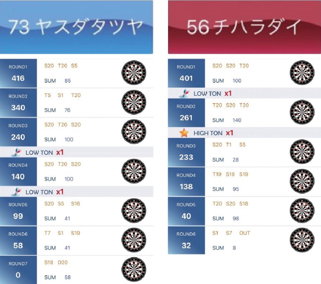 3leg目、先行スタート。100スタートからの140と削りはいい感じ。飛びの修正ができていないのがネックではあった。4R目でテンパイ。相手とは100点近く差があった。残り70点をT10からいくかT18で迷ったがT18をチョイス。S18からS20で32テンパイを狙うが、なんと2本目がアウトボード。1本損をした。そこから相手も追い上げてくる。32トライをミス。16トライをミス。2トライを2回ミスして負け。ダブルに泣いたlegとなった。飛びが悪くイメージが悪い中での試合。うまく調整できずに初戦敗退となってしまった。
