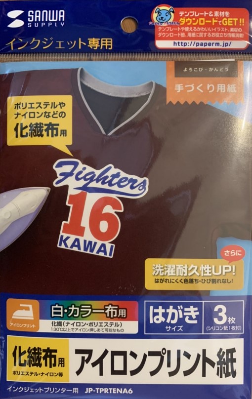 今回使ったアイロンプリント紙は、サンワサプライ株式会社の化繊布用アイロンプリント用紙JP-TPRTENA6。公式では700円前後するようだが、アマゾンで送料込374円で購入できた。3枚入りだ。