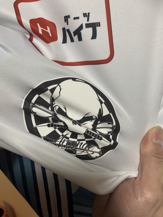 試しに、以前使っていたユニフォームでテストプリントしてみた。なんとかなりそうなので、いざ本番。これはまだ印刷前。場所の確認だ。用紙ははがきサイズを買った。印刷後、ハサミでロゴの形にカットしたものになる。
