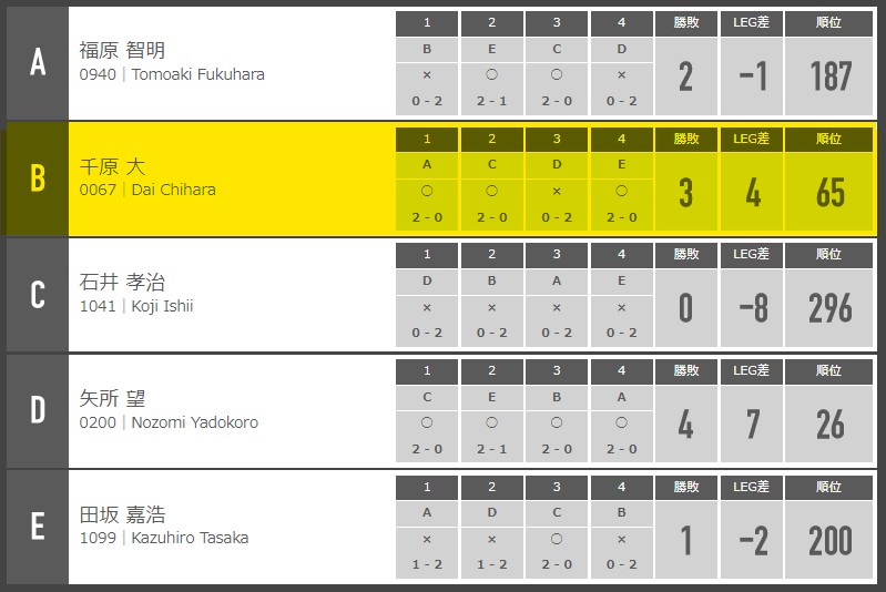 コーク負けの01後攻スタート。立ち上がり、左右のズレはほとんどなくうまく腕が振れている感じ。手離れこそ改善したい部分があるものの1試合目にしては良いダーツができた。スト勝ち。