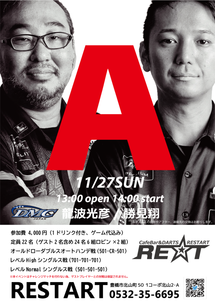 11月27日(日)勝見翔プロ&龍波光彦プロ来店イベントのプロモーションも兼ねてお邪魔します(笑)イベント会場は愛知県豊橋市のRESTARTです。