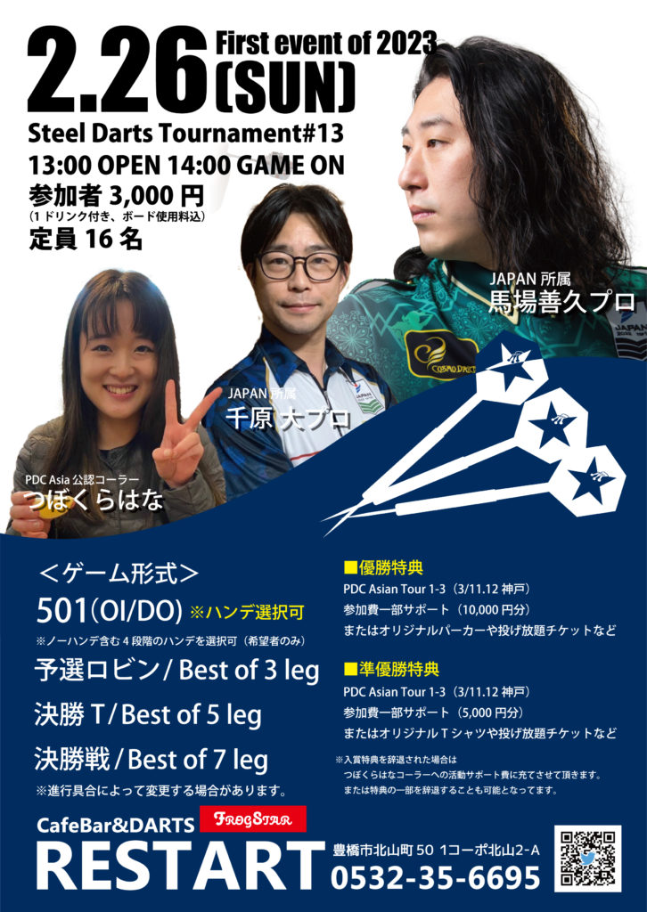 2月26日(日)馬場善久プロと坪倉はなコーラーを招いてのスティールダーツトーナメントを開催します。入賞特典として心ばかりですが、PDC Asian Tour 2023 1-3 KOBEの参加費の一部をサポートさせて頂きます。参加されない方にはRE★Tオリジナルパーカーや投げ放題チケットをプレゼントします。★つぼくらはなコーラー支援チケットも当日販売してます★画像にリンク張ってます。