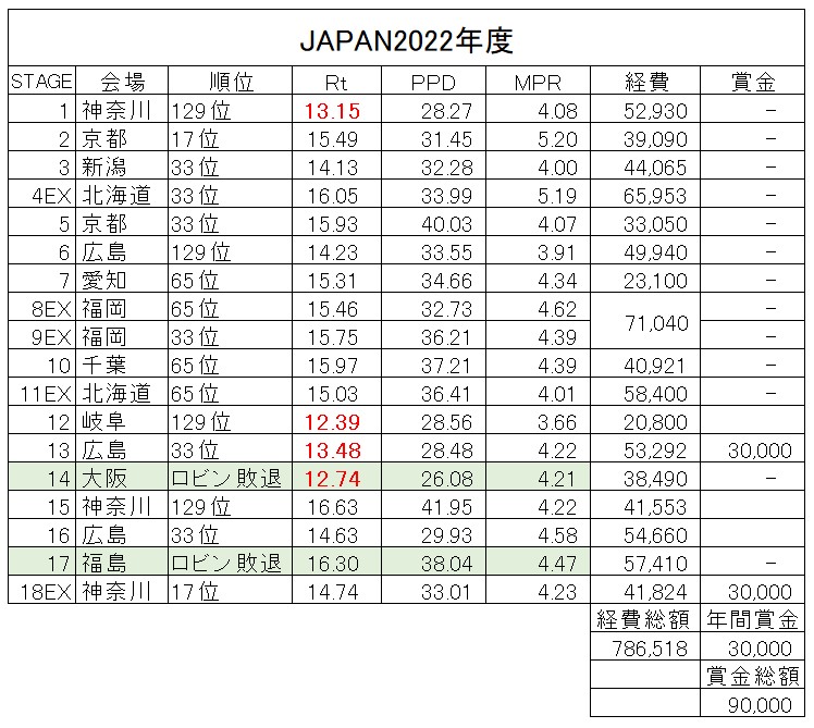 先日のSTAGE18神奈川大会を終え、2022年度JAPANツアーがすべて終了いたしました。改めて応援頂いた方、支えて頂いた方ありがとうございまいした。無事全18戦戦い抜くことが出来ました。改めて結果報告とお礼をさせて頂きます。