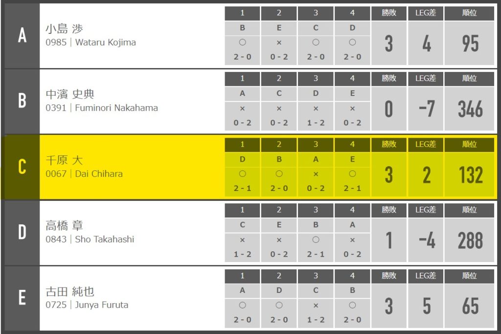 敗因として言い訳っぽくなるが、5人ロビンの3人目(C行)。3試合目は審判後すぐに試合を行わなければならない。他の選手は審判後1試合空く。先の2試合を連勝したこと、審判後の試合だったことが心のスキを生んでしまった。反省。次に活かしていく。