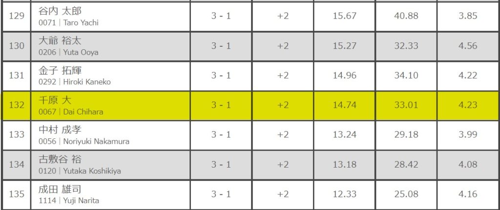 PPD35.50 MPR4.59 PPD31.86(8R1本目22本)1-0+1