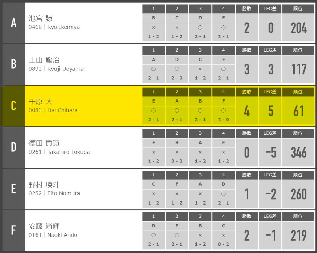 2回戦目は座波プロ。エンジェルスの大谷選手の言葉「憧れを捨てる」そして、今日はブルがあってる感覚がある。気持ちを強くもって試合に臨む。結果は2-1で勝ち。PPD36.72 MPR5.11 MPR4.38