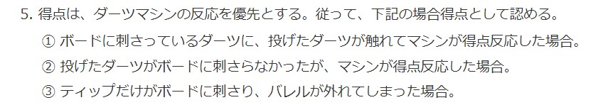 補足として、JAPANのルールでは、反応または、刺さったところが優先となるので、T18に刺さったダーツに当たってT18が反応し、S18に刺さった場合は、T18からS18に修正されます。ただ、刺さっている状態であれば修正とあるので、刺さらなければT18として扱うということになる。