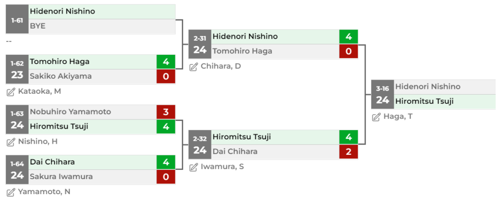 ベスト64。相手選手が前半すこし合わない感じがあったところでしっかり勝ち切れた。後半、2つとられて少し焦ったが、なんとか勝ち。少し震えた記憶有ります笑