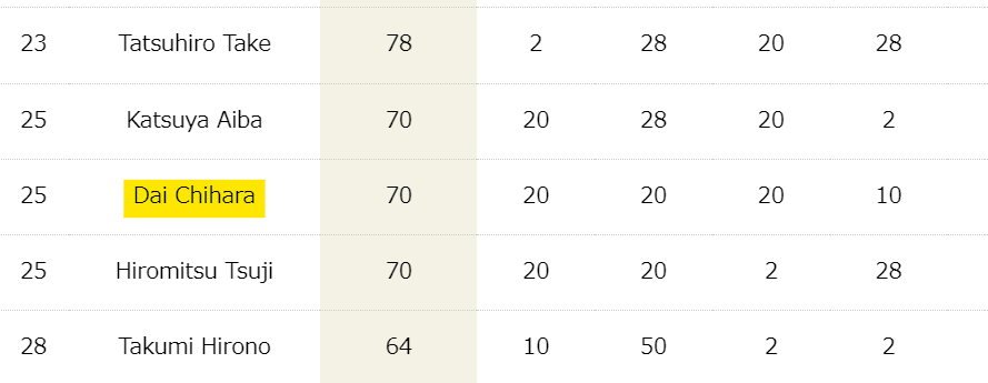 Avg Fin.ようはアウトしたときの平均点数。気にしたことなかったので今後は気にしてみてみる。